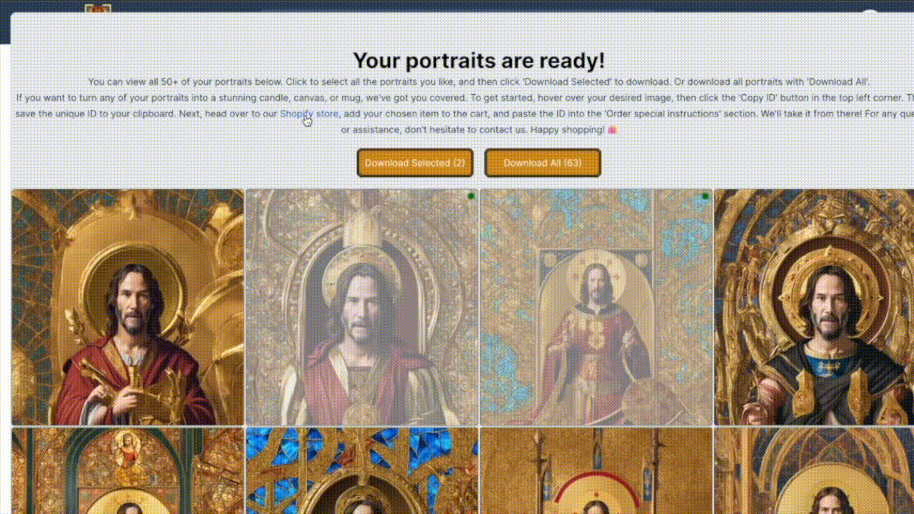 Give a truly one-of-a-kind, personalized gift to your loved ones (or yourself!), by turning your photos into Saintly portraits. Simply upload your photos and our state of the art AI engine will handle the rest. Enjoy your portraits as digital prints, or turn them into candles, mugs and more.